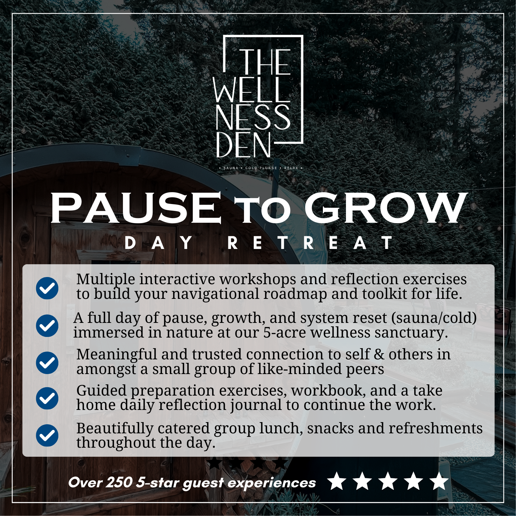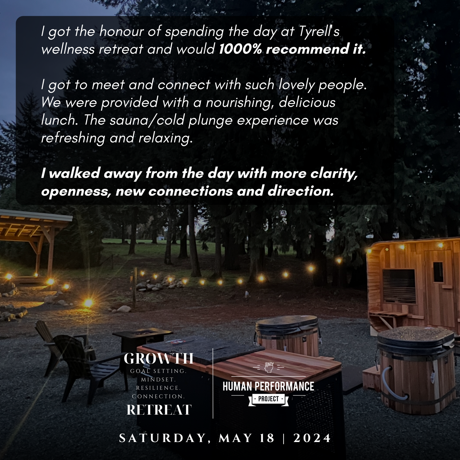 I had the pleasure of joining Tyrell at the Wellness Den for the Pause to Grow program this past weekend. From first arriving on property and being met by Tyrell I felt calmness and welcome to this majestic property. After meeting our group for the day it didn’t take long to feel safe and comfortable in the container Tyrell and Natasha have created. From our sharing to a walking meditation to breathwork and ending the day with hot and cold exposure it was absolutely perfect.