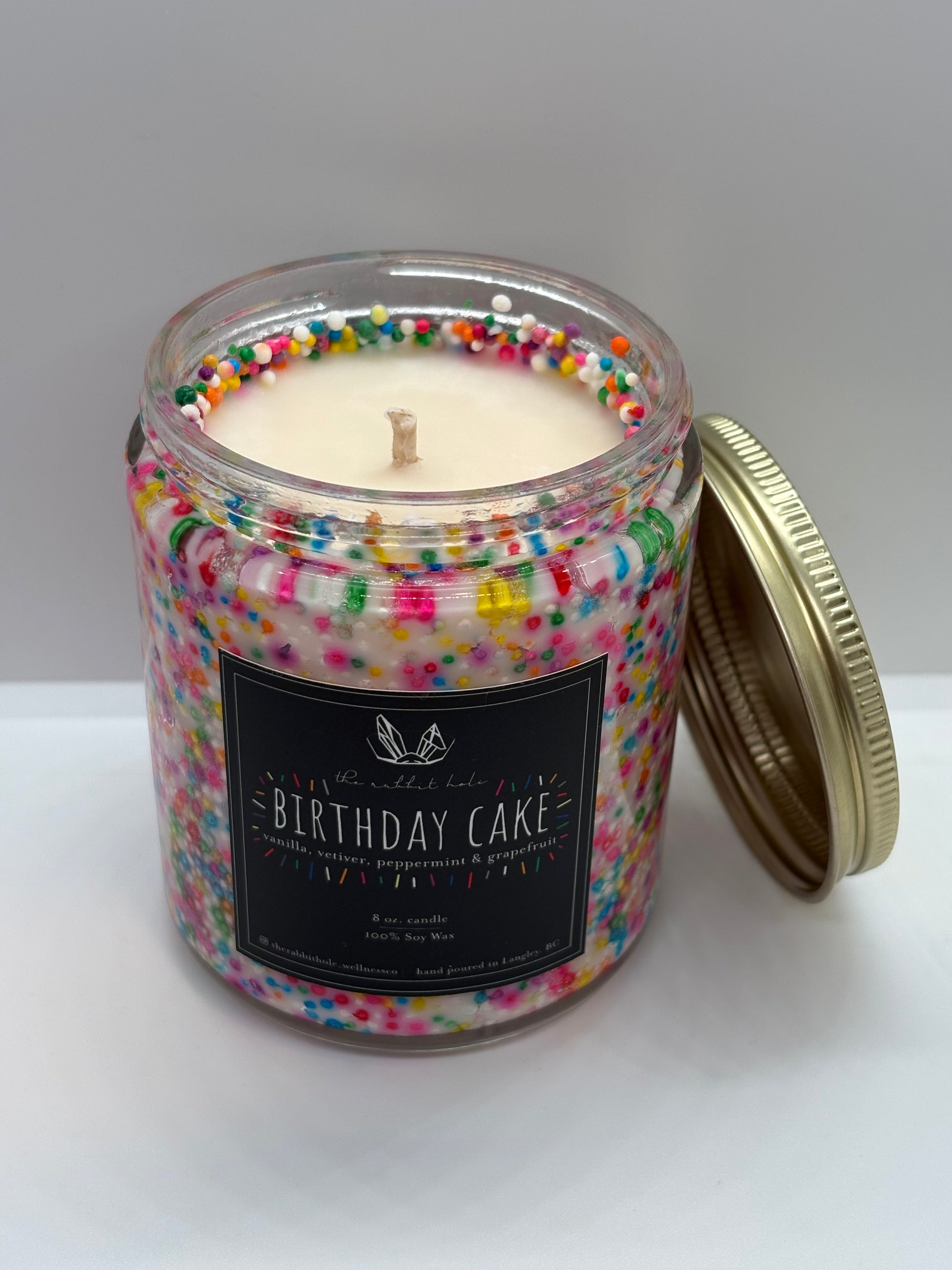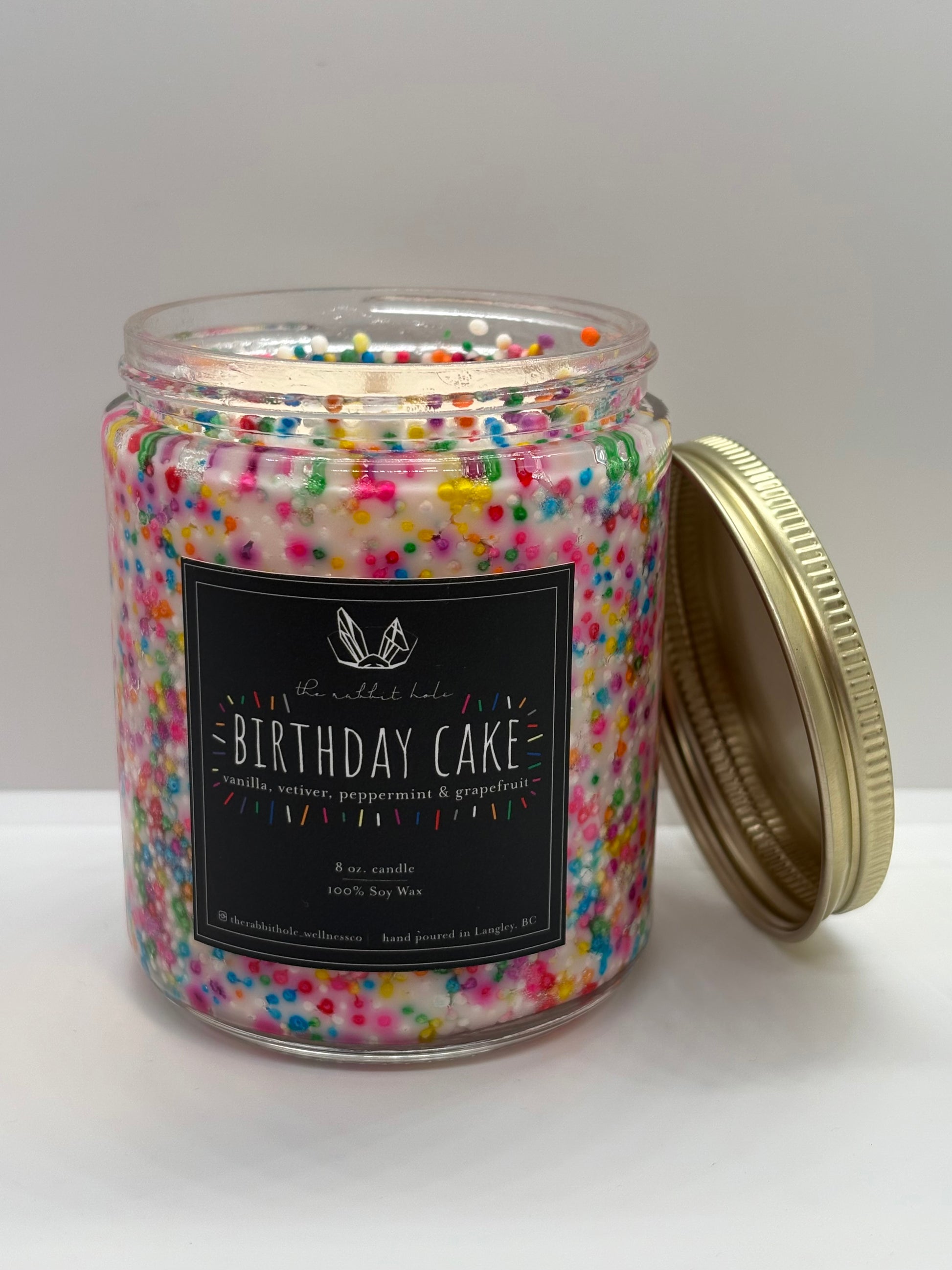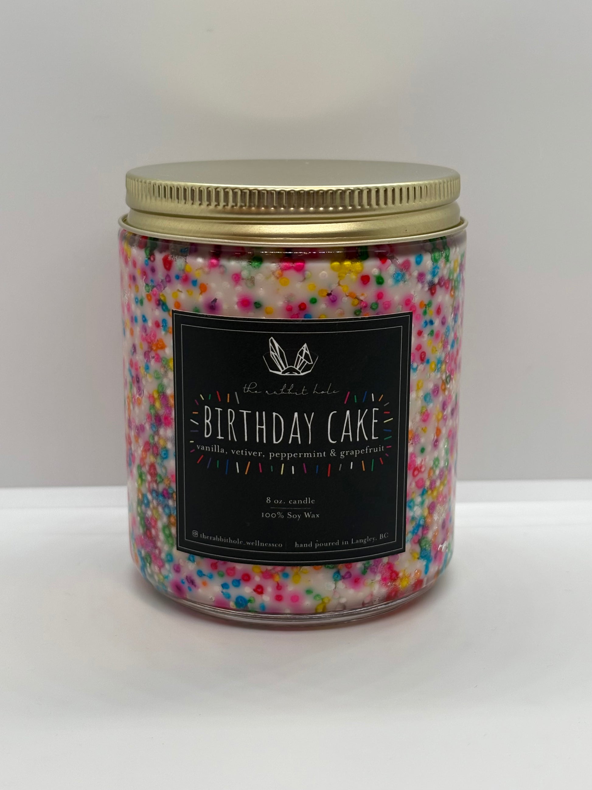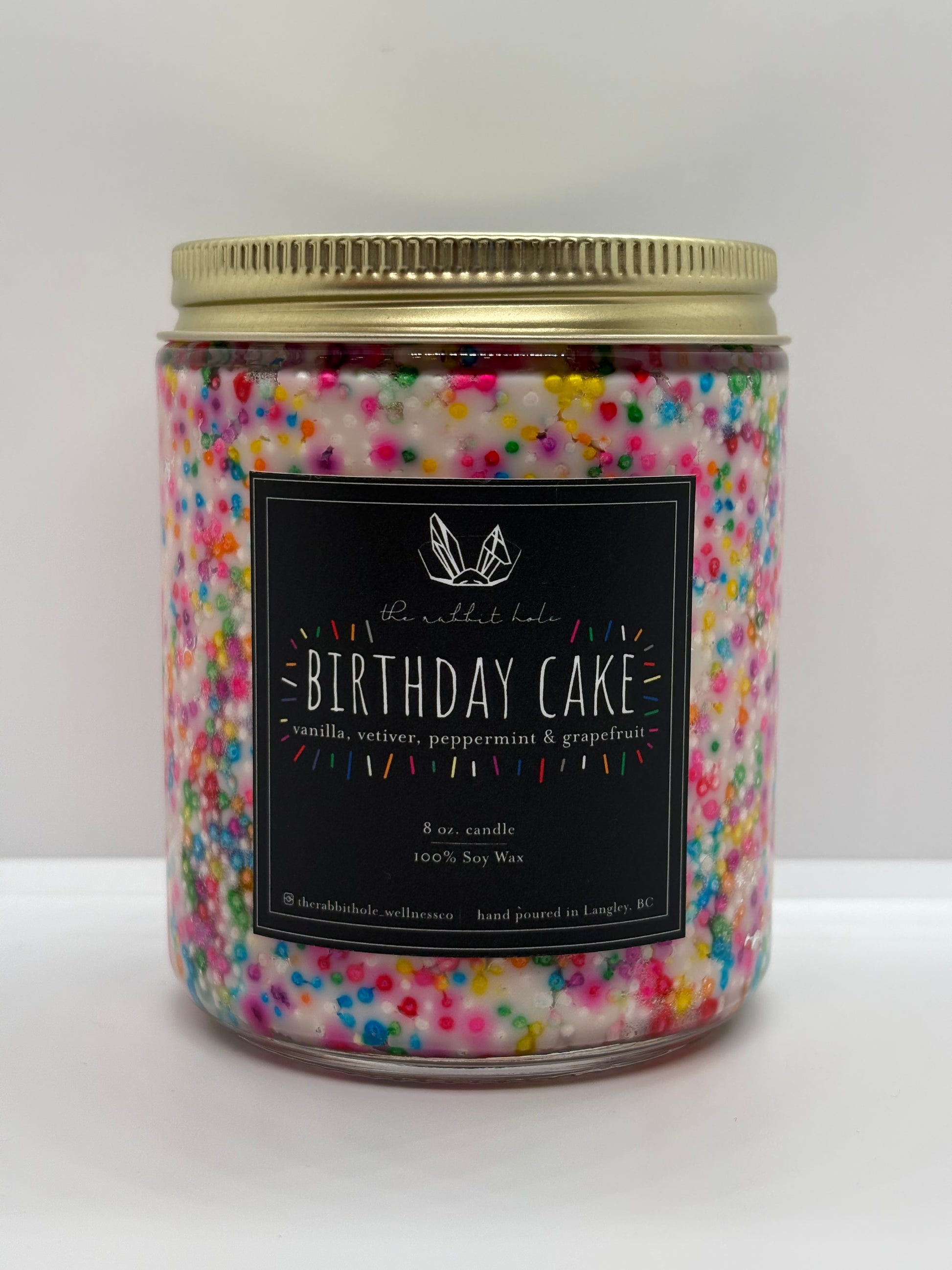“Birthday Cake” is a sweet, nostalgic blend that fills your space with the cozy scent of freshly baked treats. Infused with pure essential oils of vanilla, vetiver, peppermint, and grapefruit, it offers a playful twist on classic comfort. Finished with a colourful sprinkle vessel, this candle is as joyful to look at as it is to experience — a celebration in every light.
