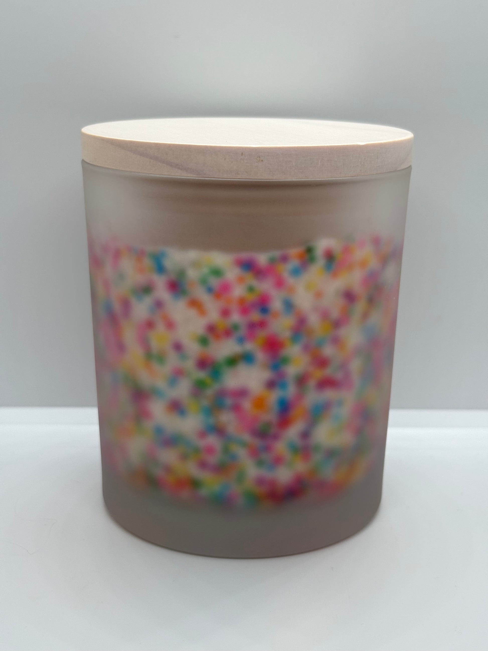 “Birthday Cake” is a sweet, nostalgic blend that fills your space with the cozy scent of freshly baked treats. Infused with pure essential oils of vanilla, vetiver, peppermint, and grapefruit, it offers a playful twist on classic comfort. Finished with a colourful sprinkle vessel, this candle is as joyful to look at as it is to experience — a celebration in every light.
