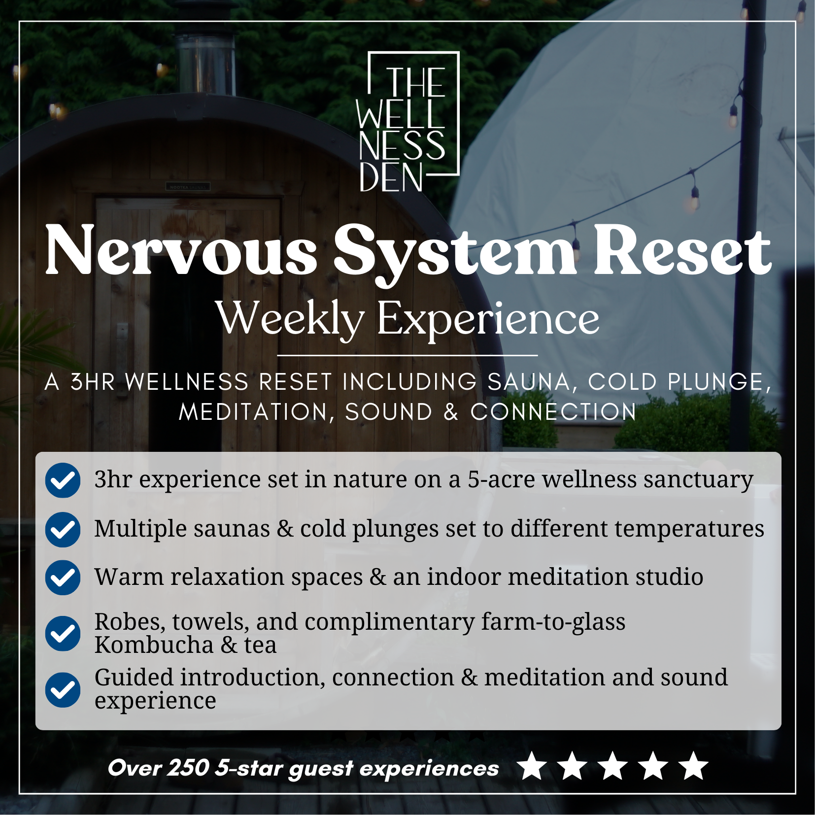 Our weekly nervous system reset sessions are meant for individuals and groups who are ready to give themselves the permission to pause, to reset, and to find a moment of stillness and growth amidst full lives. You will be guided by your host, Tyrell, through a facilitated introduction, orientation and moment of connection as a group before enjoying a long and restorative sauna, cold plunge and relaxation experience on our 5-acre wellness sanctuary. Each nervous system reset experience ends with a guided meditation and sound experience in our indoor meditation studio to further integrate the benefits and impact of your session. Come for a quiet and peaceful solo experience, or invite friends, colleagues or family members to enjoy together.