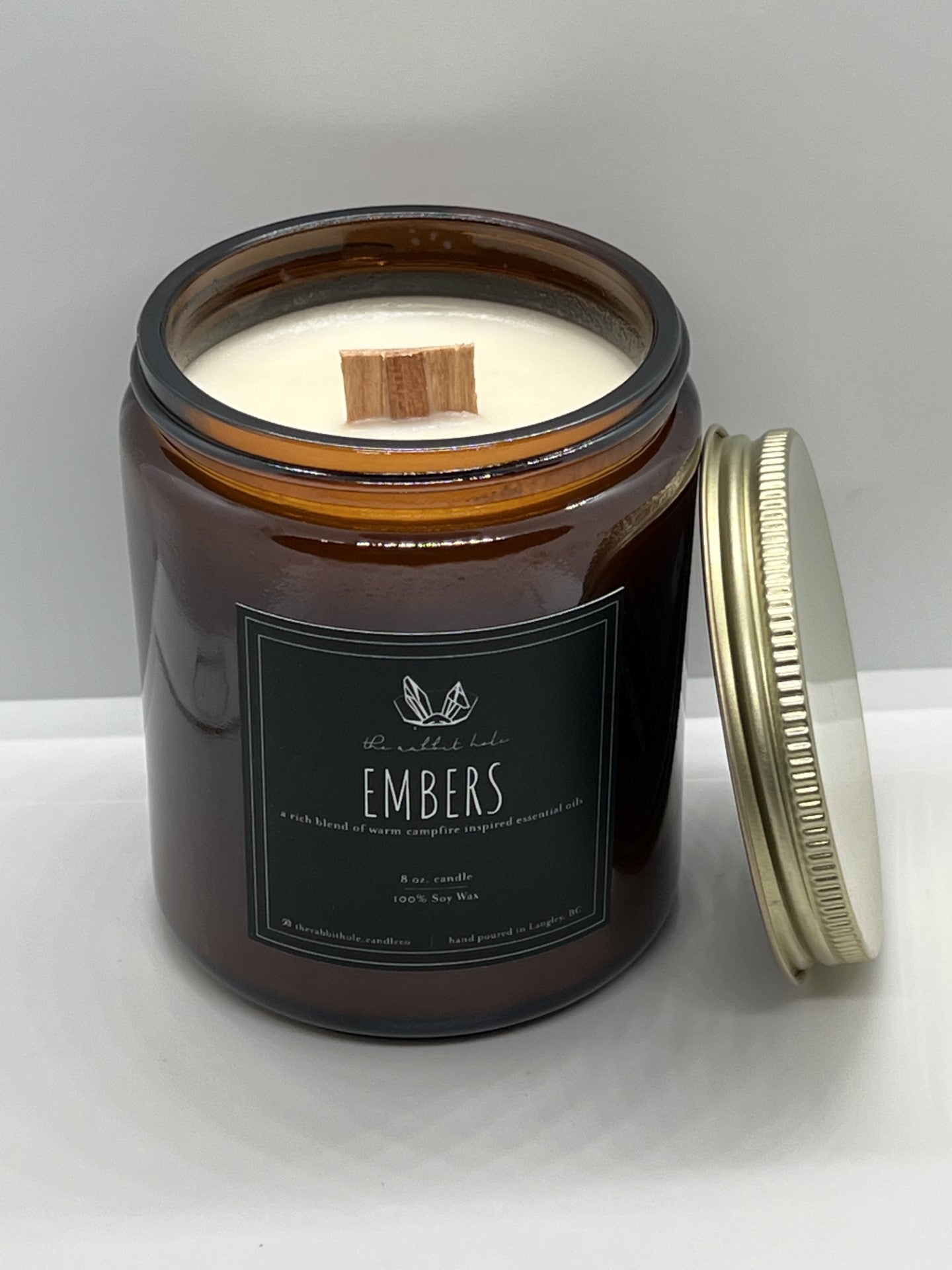 All of our candles are made with 100% soy wax. “Embers” is a mix of campfire inspired oils. It is earthly, woodsy and warm. It is created with black pepper, cedarwood, sandalwood, patchouli, vanilla, orange and peppermint pure essential oils. "Embers" also has a crackling wood wick.