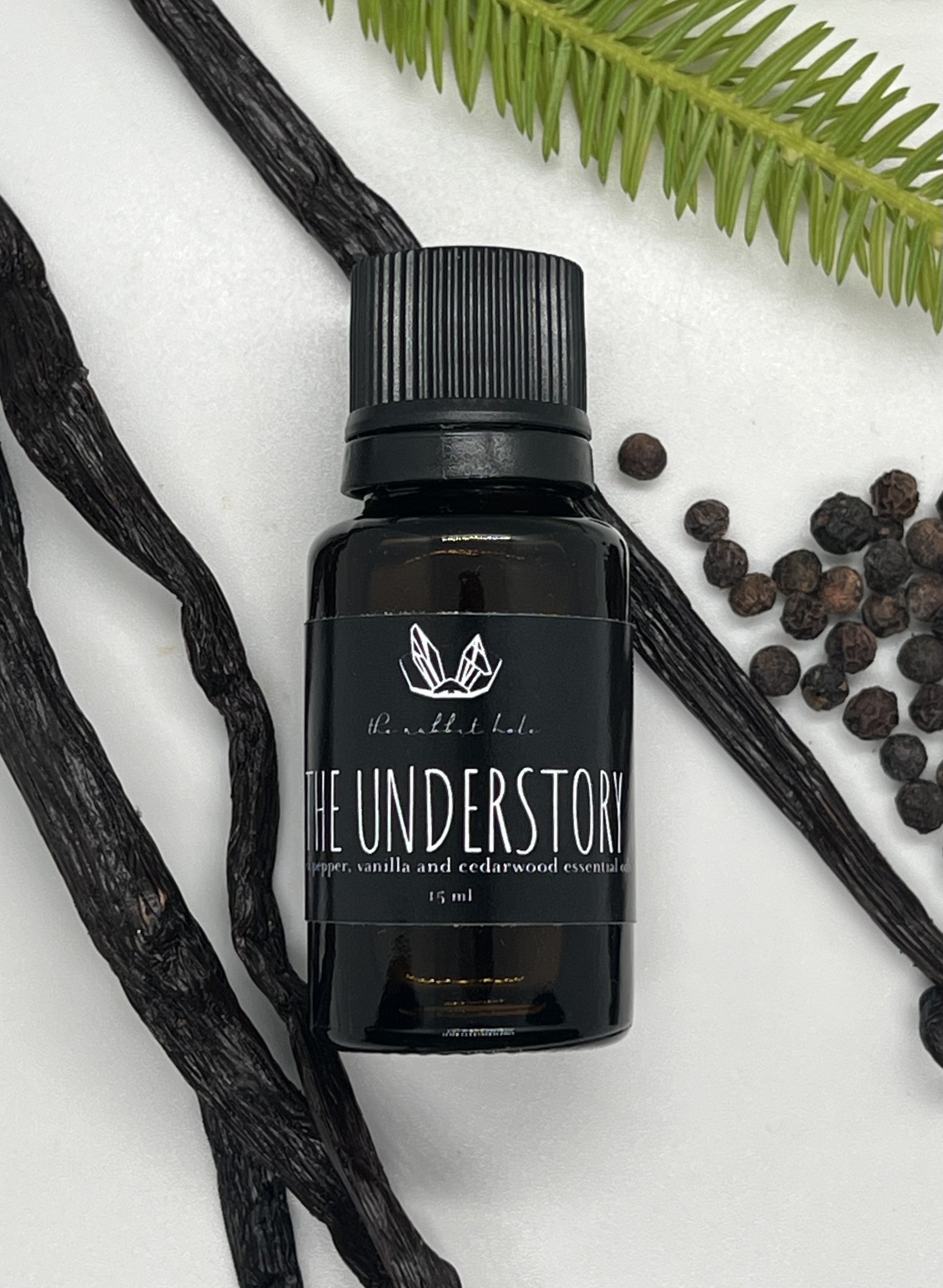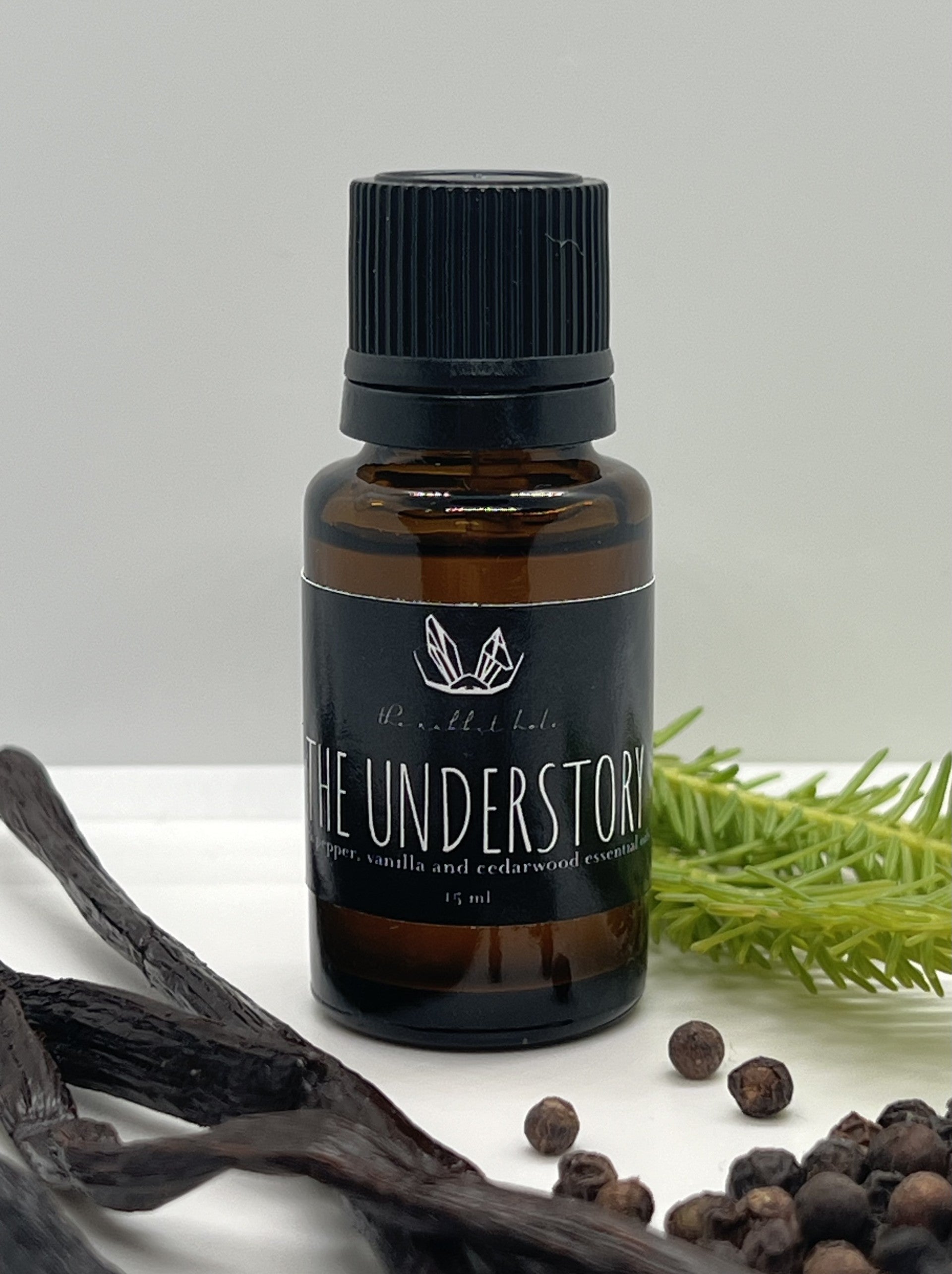 "The Understory" is a combination of vanilla, cedarwood and black pepper pure essential oils. This is a relaxing and earthy mix of essential oils. Enjoy the scents that you have enjoyed in the candles and other products from "The Rabbit Hole" now in your own diffuser.