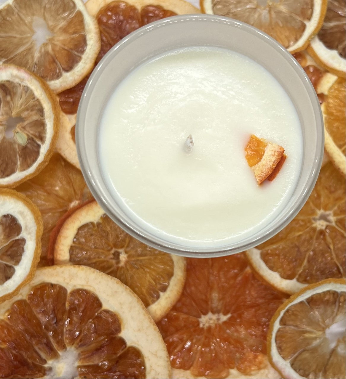 All of our candles are made with 100% soy wax. “Golden Hour” is a citrus candle created with a medley of pure essential oils: grapefruit, bergamot, orange and lemon.