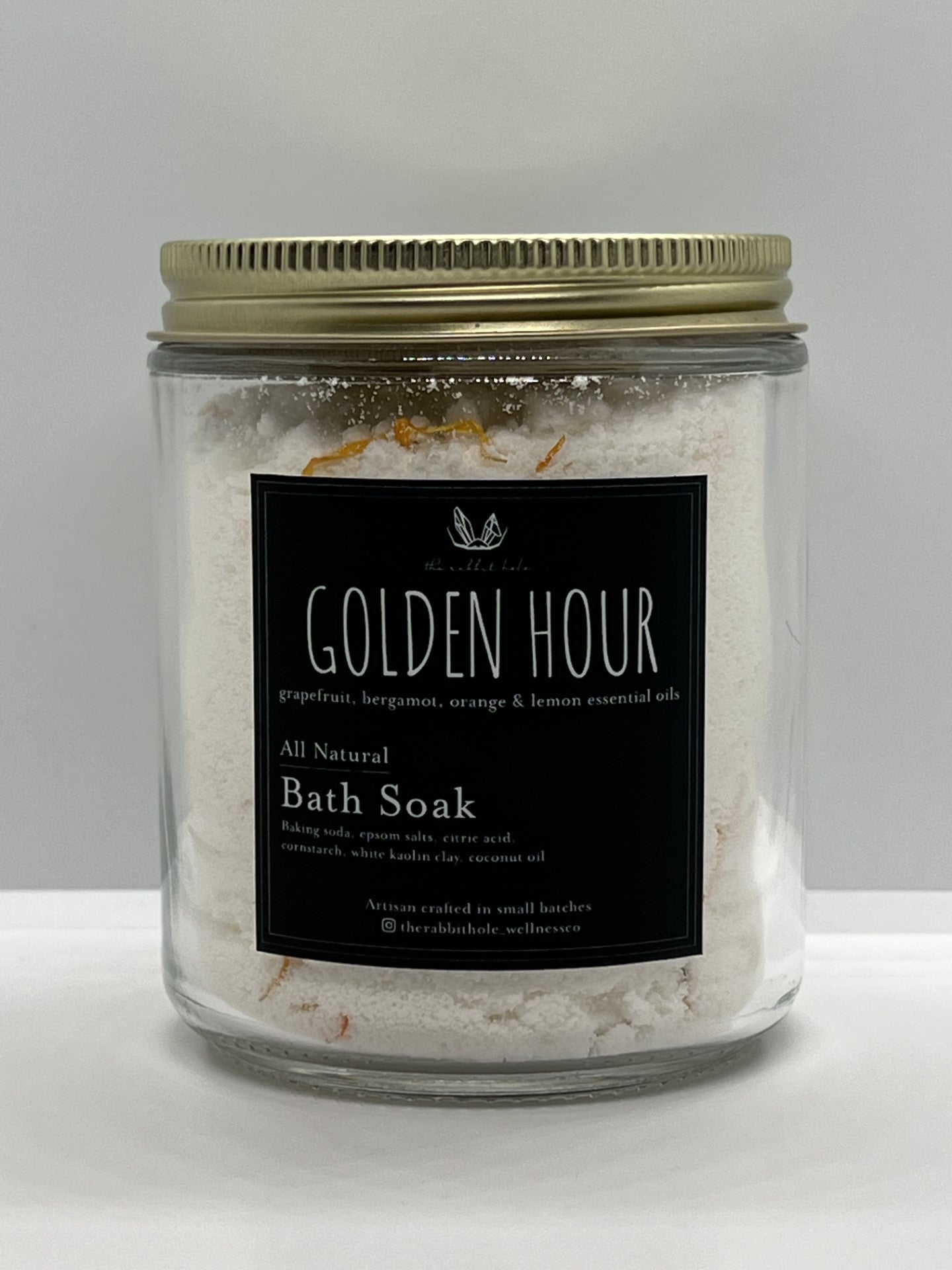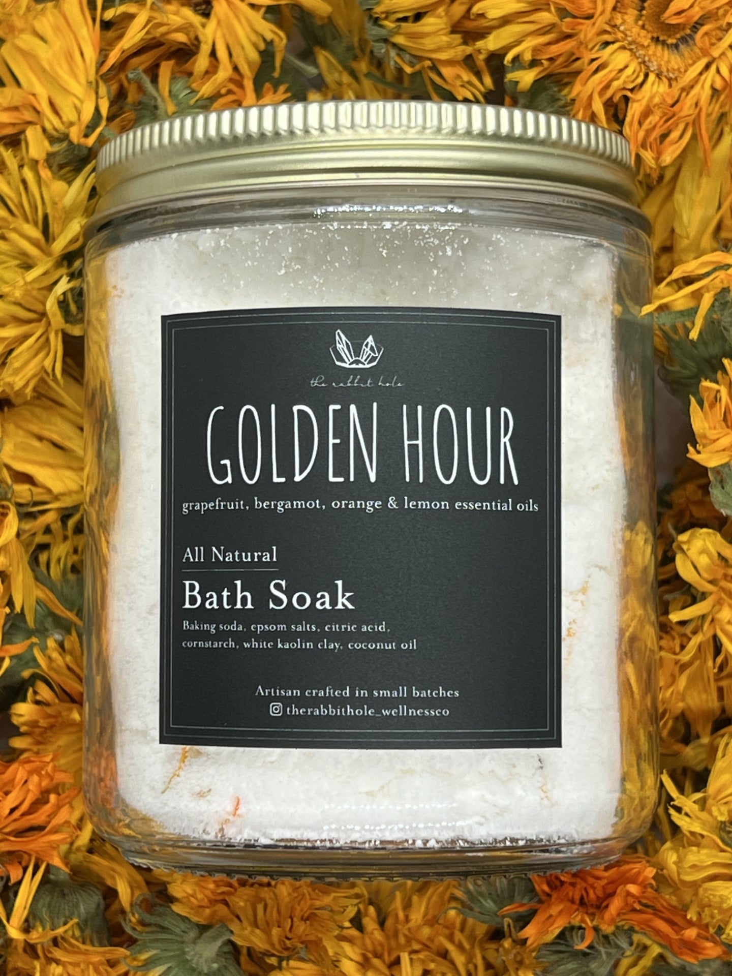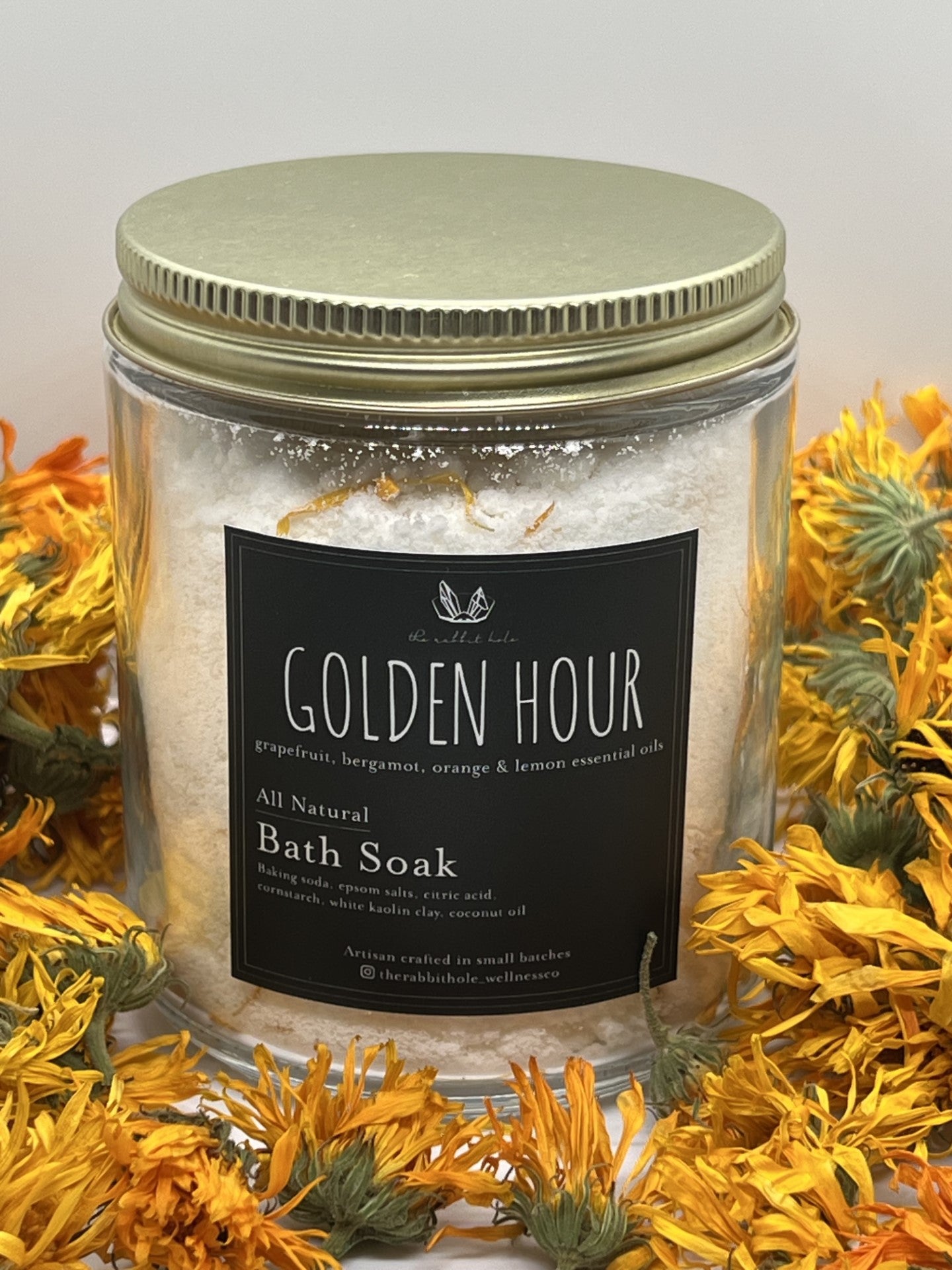 The Golden Hour salts are extra special because they have "O'Bella Farms" locally grown calendula flowers in them!