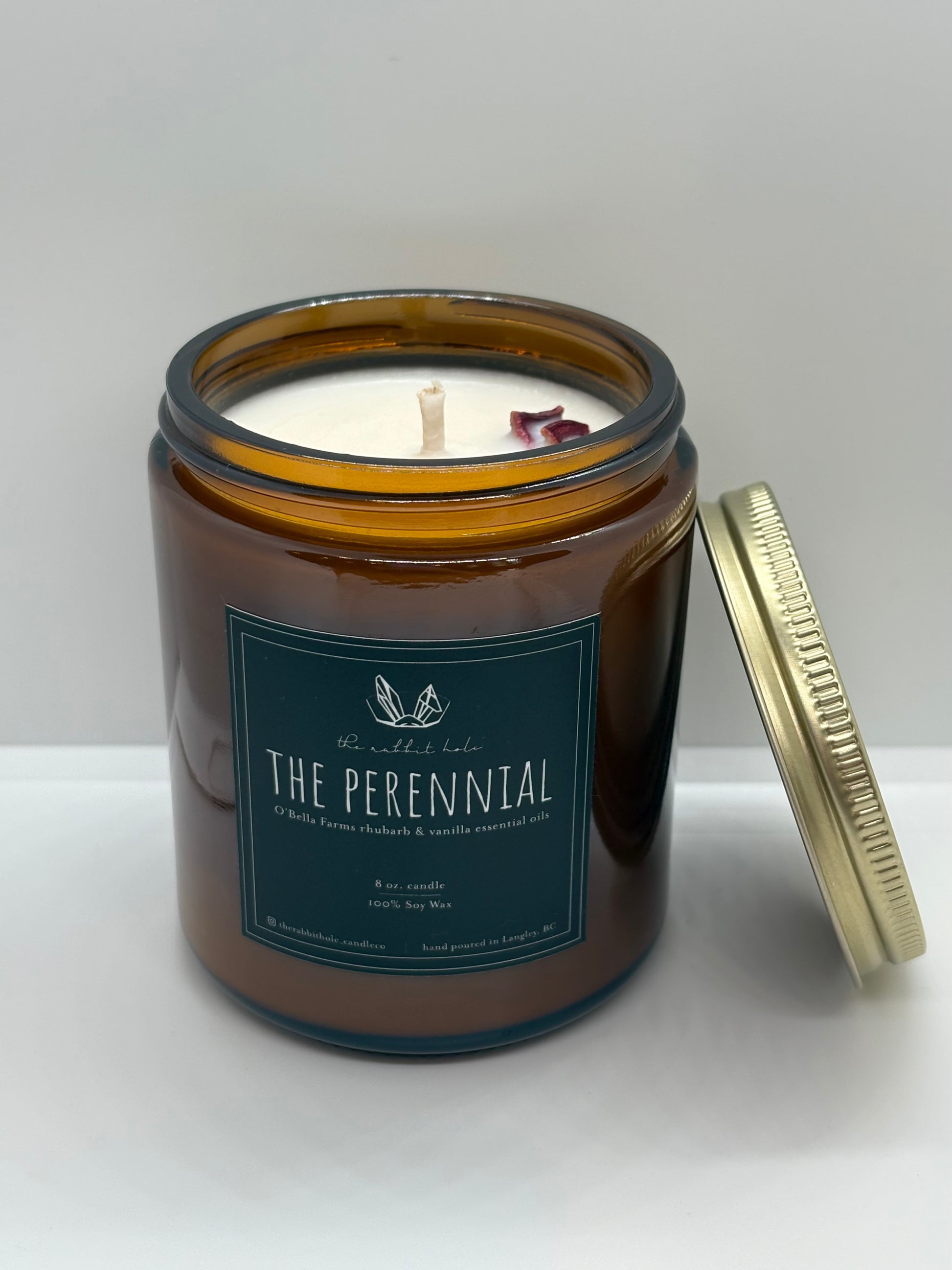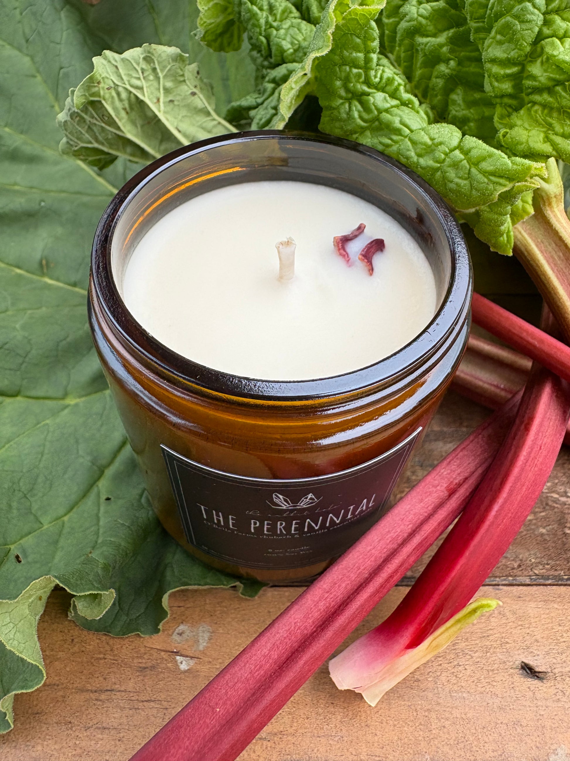 All of our candles are made with 100% soy wax. “The Perennial” is a candle that will take you back to the farm. It has rhubarb natural oils and vanilla pure essential oils.