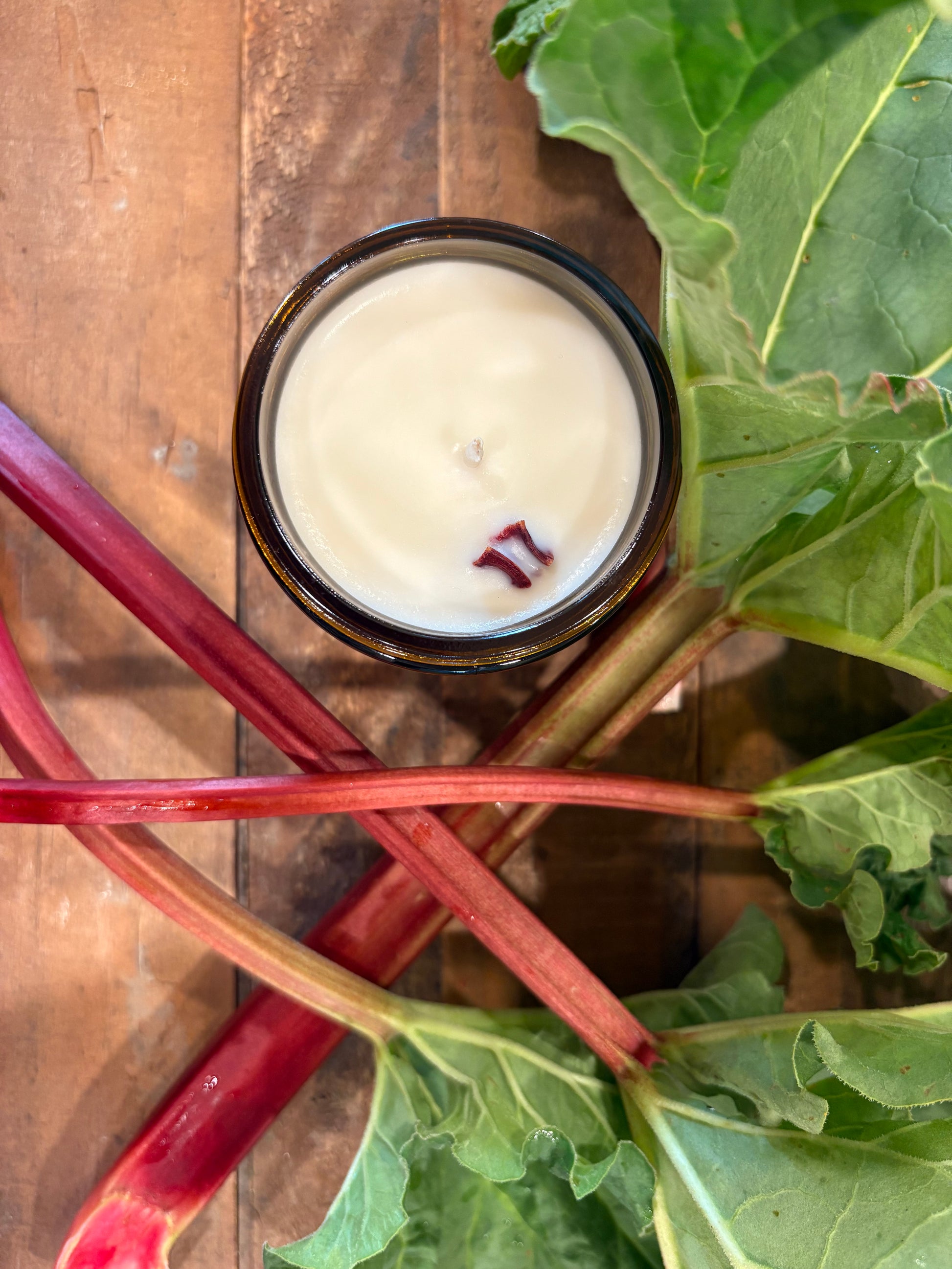What makes this candle extra special? It’s topped with our very own farm-grown rhubarb — carefully harvested, dehydrated, and hand-placed to add a rustic, seasonal touch. A true nod to the land it came from.